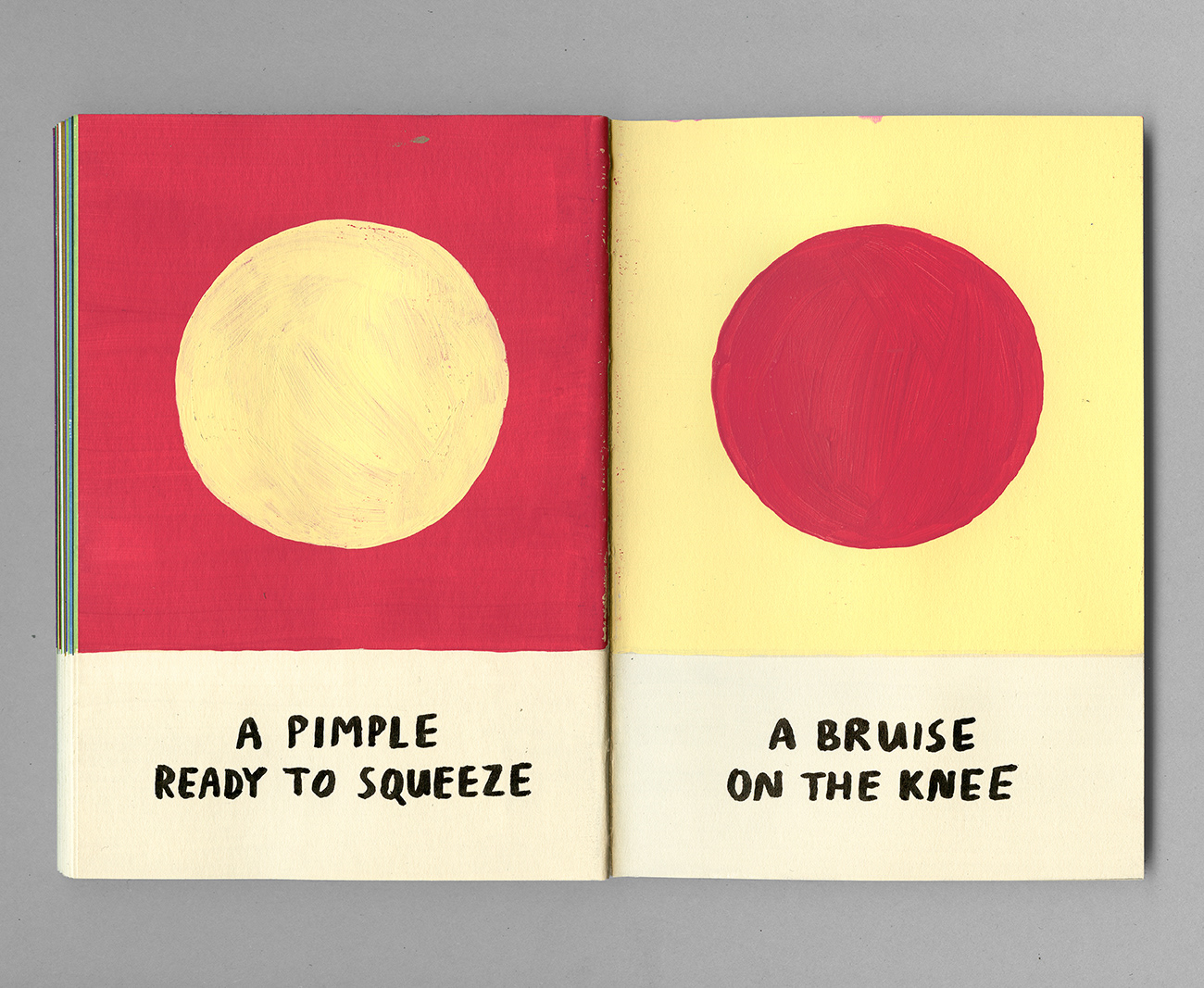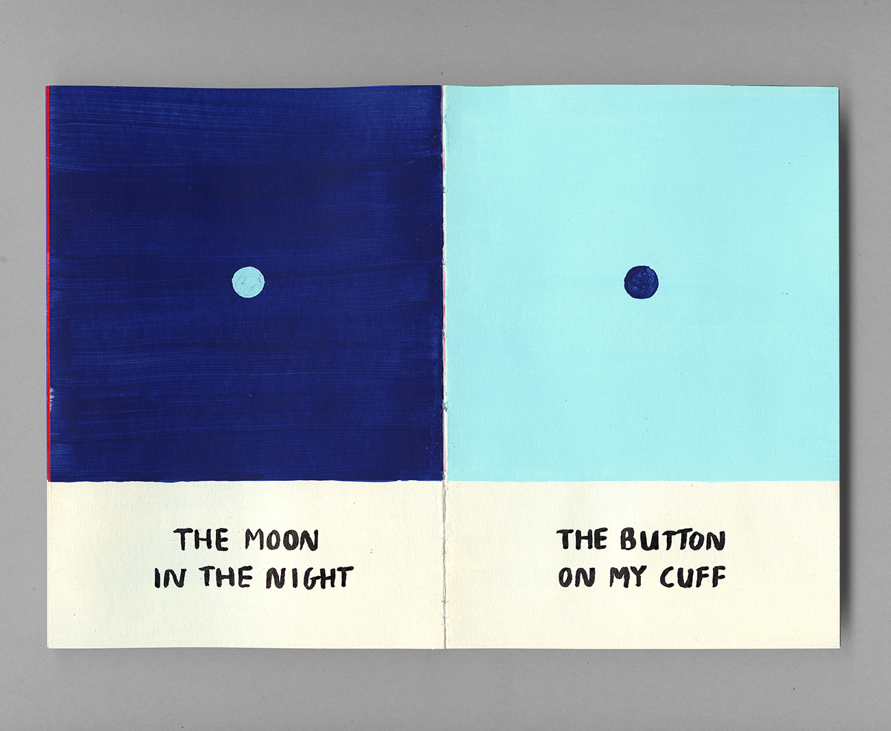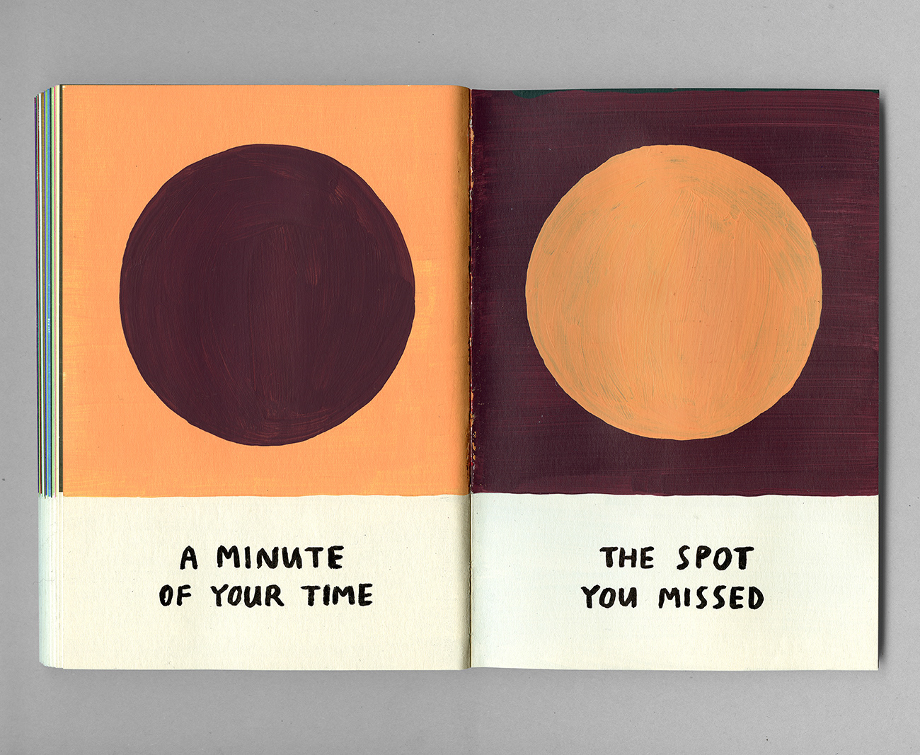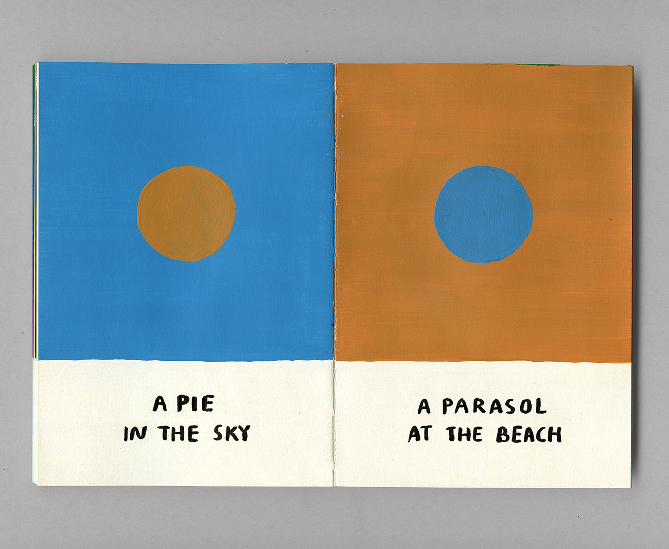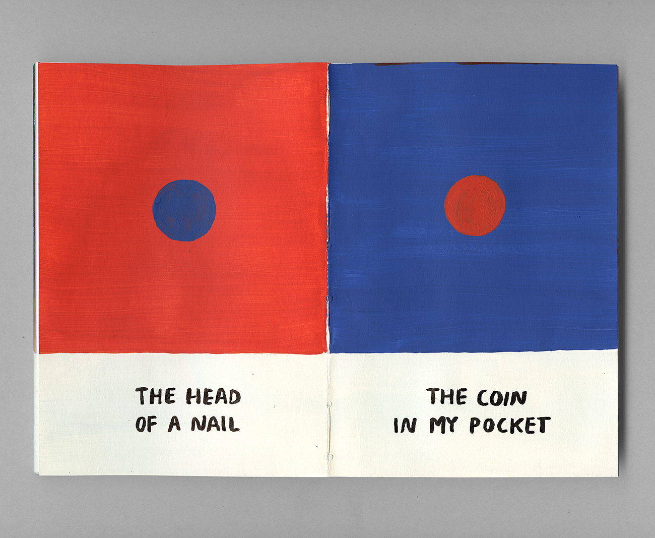 This hand painted book project stems from an imaginative game of association using only pairs of identical circles, presented across double page spreads in inverted colour combinations, as a simple prompt. Over 37 pairs, I responded with the accompanying bits of text to the shape, size and colour of the circles and tried to make connections or surprising leaps between them. This project was inspired by ‘A moon or a button: A collection of first picture ideas’ by Ruth Krauss and Remy Charlip. Acrylic Painted book, 76 pages, 10.5 x 14.8 cm, 2024.