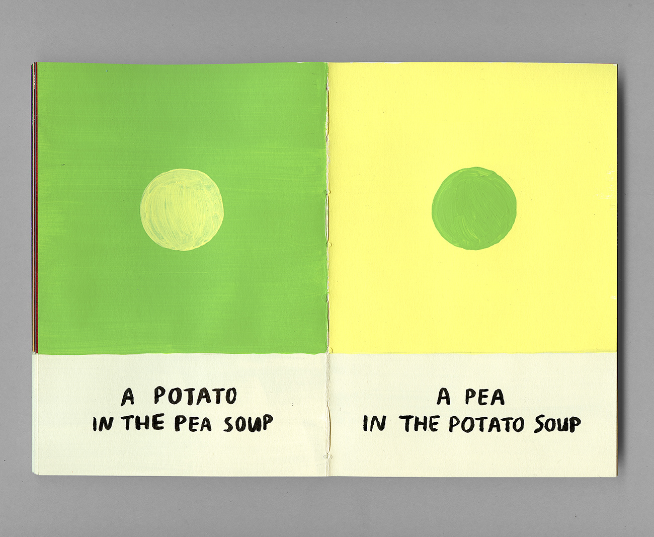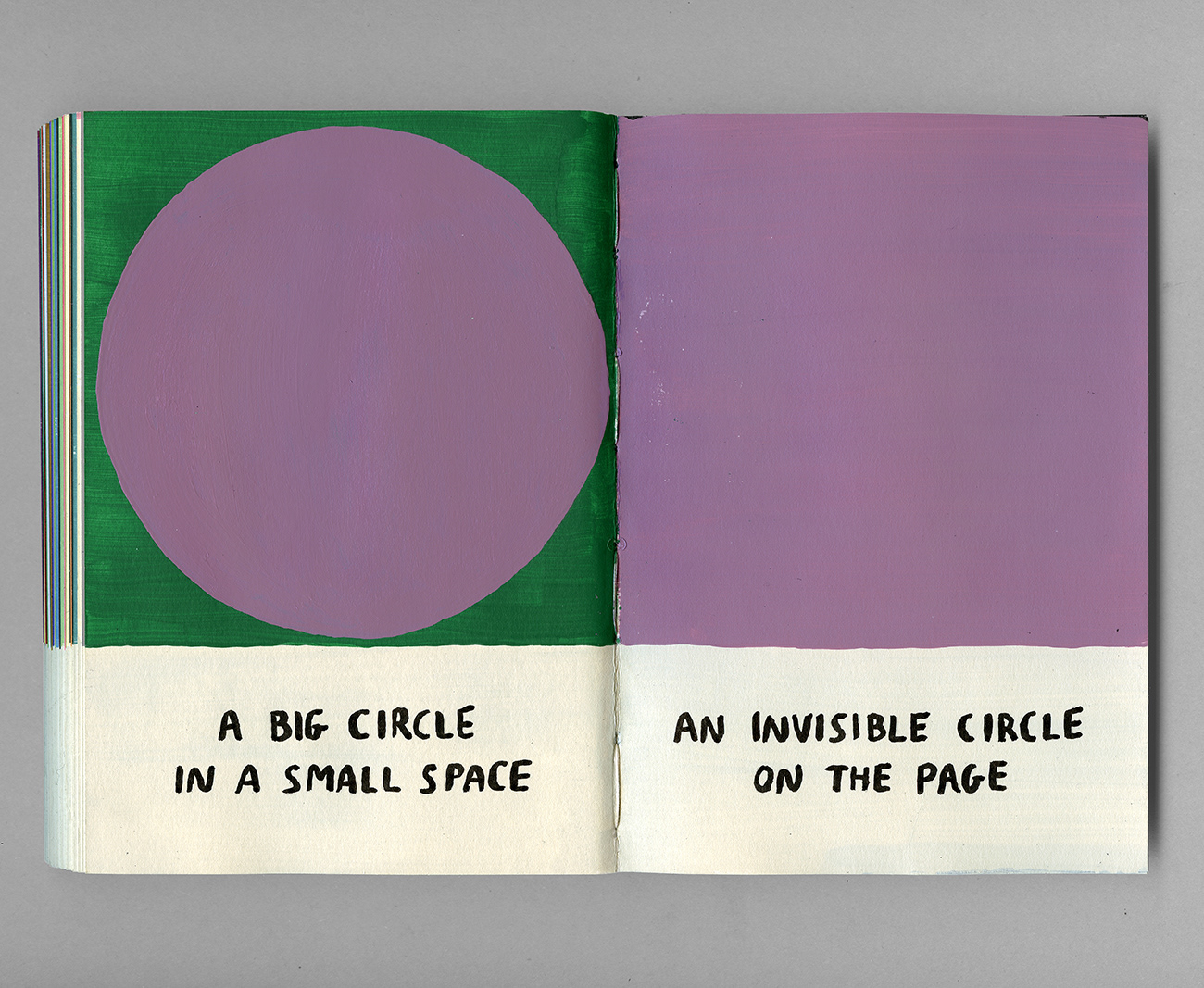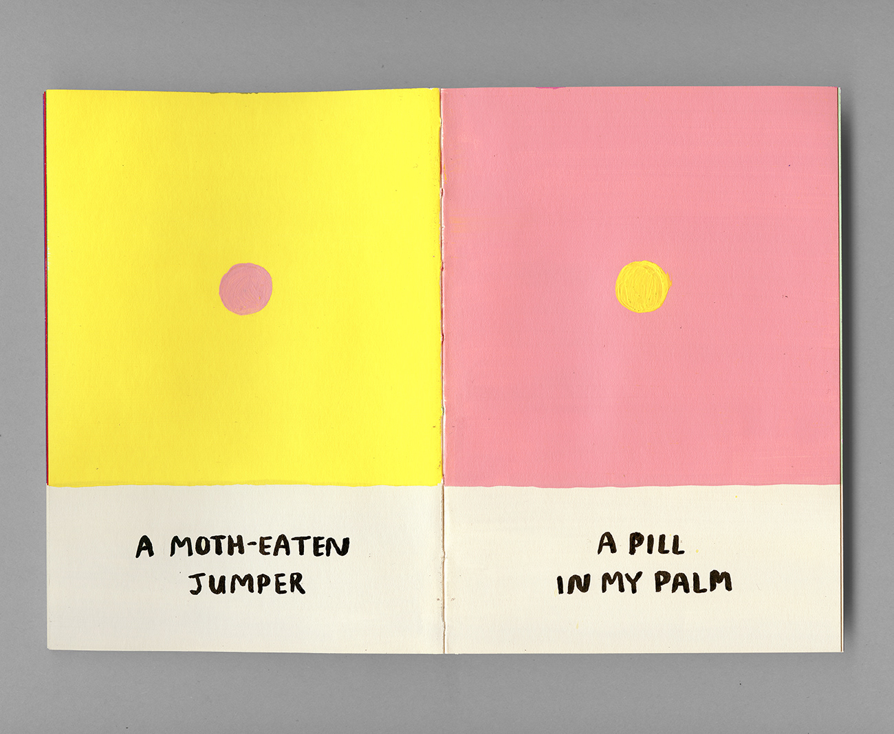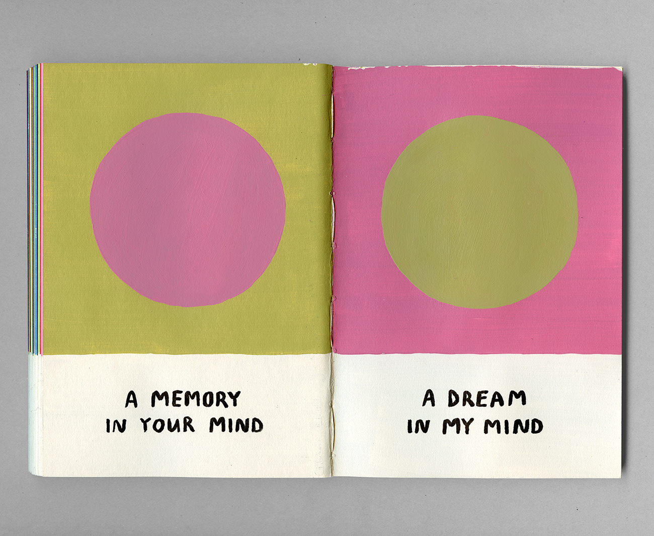 This hand painted book project stems from an imaginative game of association using only pairs of identical circles, presented across double page spreads in inverted colour combinations, as a simple prompt. Over 37 pairs, I responded with the accompanying bits of text to the shape, size and colour of the circles and tried to make connections or surprising leaps between them. This project was inspired by ‘A moon or a button: A collection of first picture ideas’ by Ruth Krauss and Remy Charlip. Acrylic Painted book, 76 pages, 10.5 x 14.8 cm, 2024.