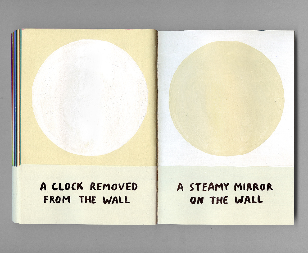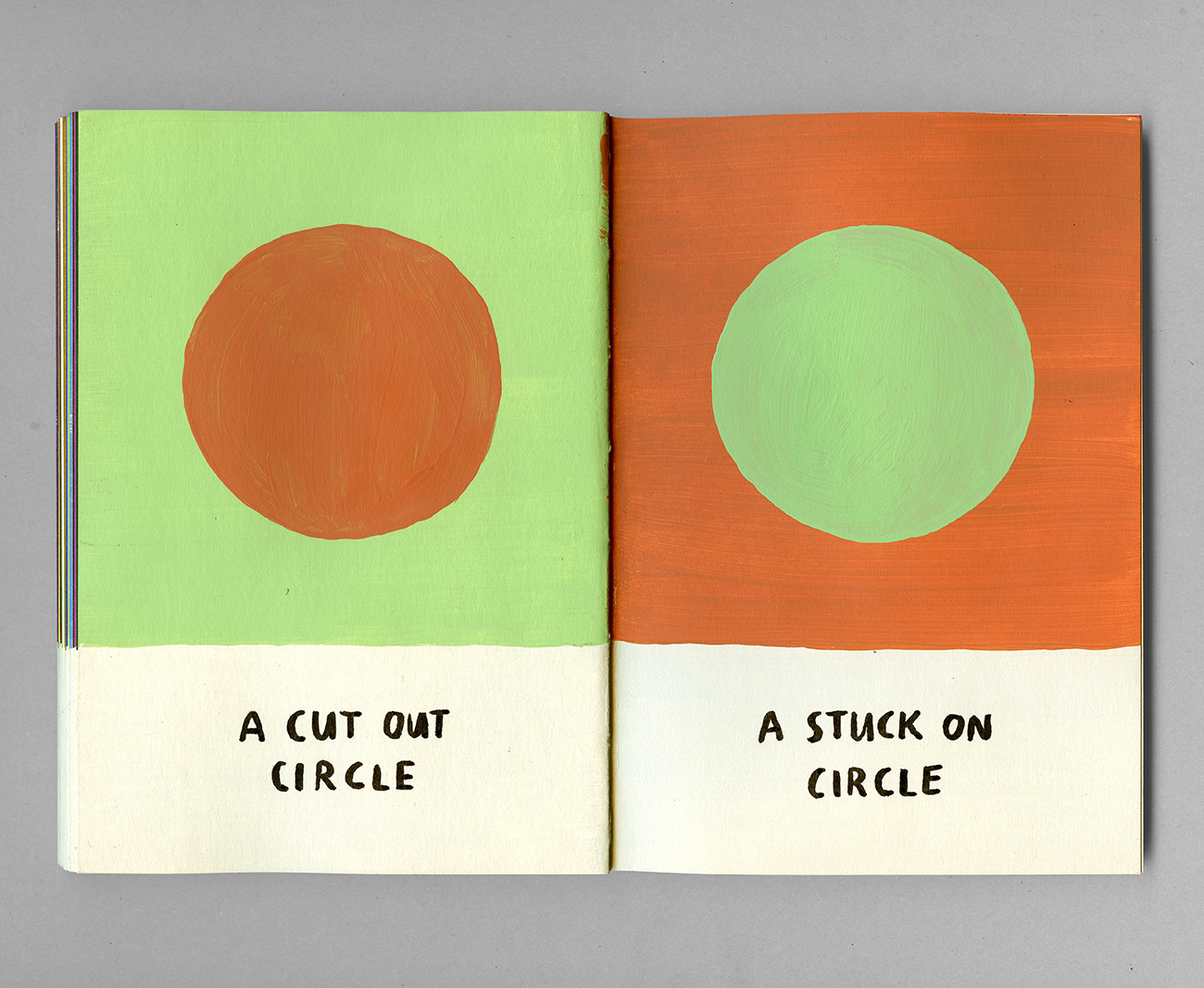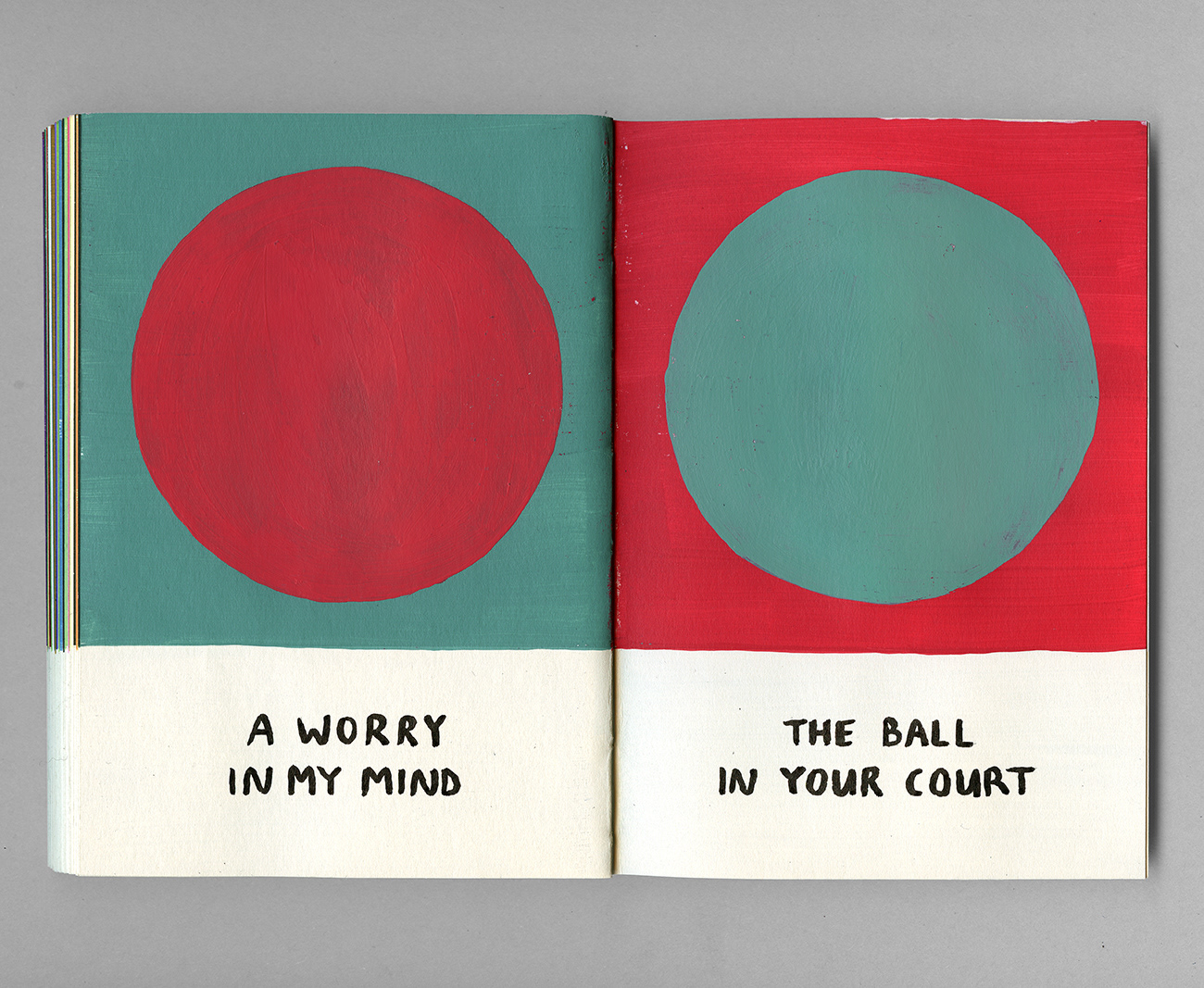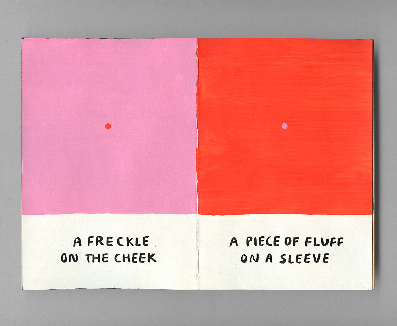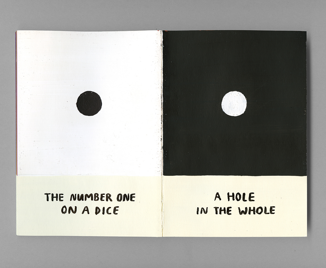 This hand painted book project stems from an imaginative game of association using only pairs of identical circles, presented across double page spreads in inverted colour combinations, as a simple prompt. Over 37 pairs, I responded with the accompanying bits of text to the shape, size and colour of the circles and tried to make connections or surprising leaps between them. This project was inspired by ‘A moon or a button: A collection of first picture ideas’ by Ruth Krauss and Remy Charlip. Acrylic Painted book, 76 pages, 10.5 x 14.8 cm, 2024.