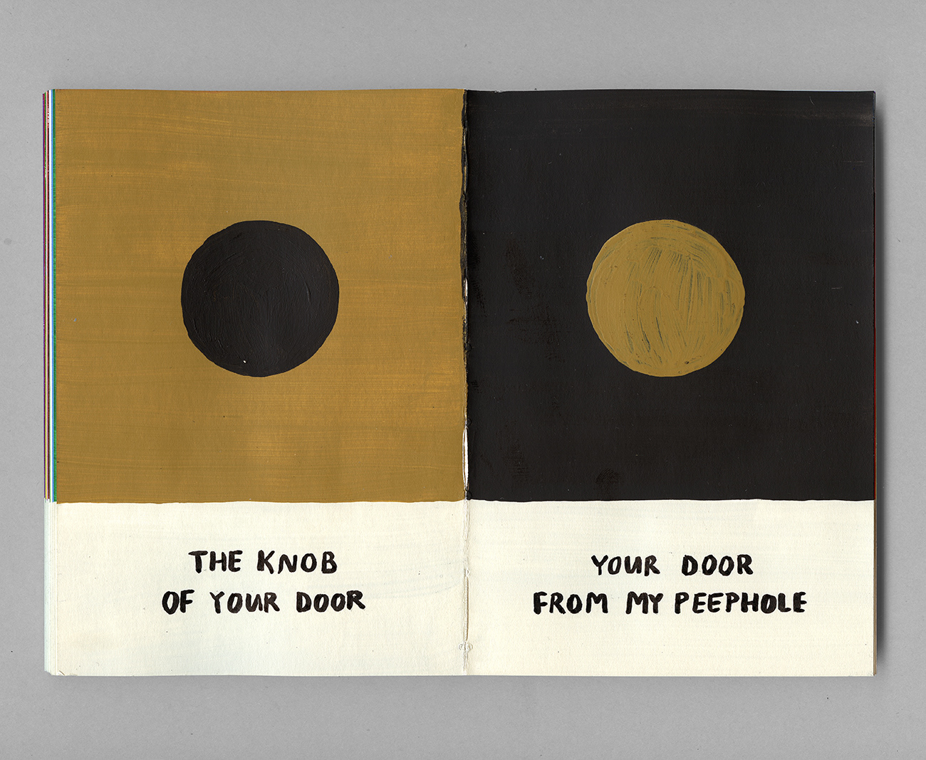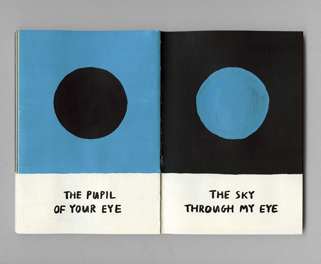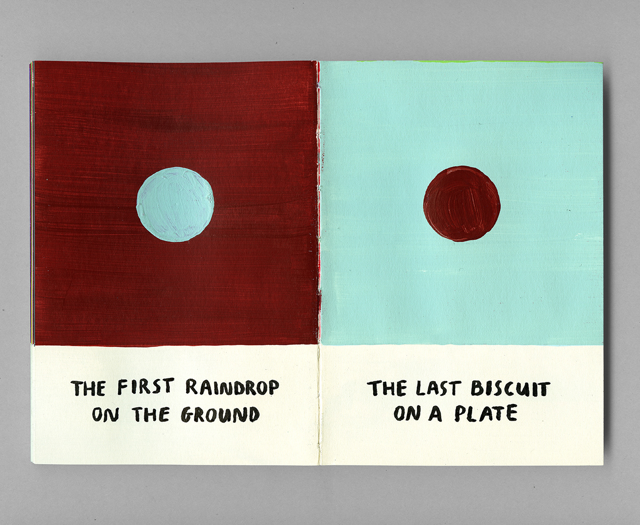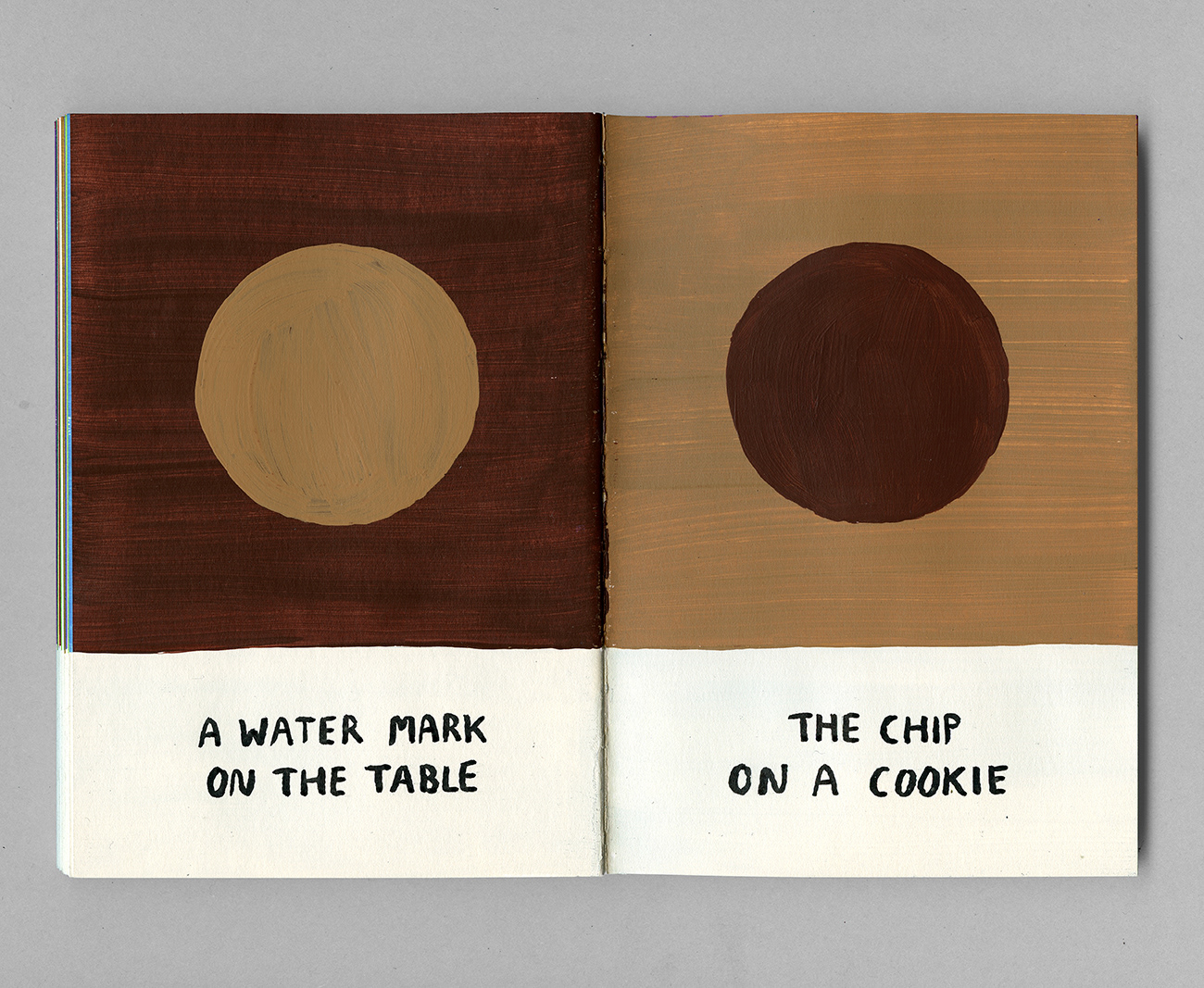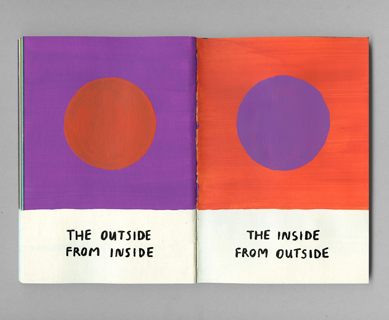 This hand painted book project stems from an imaginative game of association using only pairs of identical circles, presented across double page spreads in inverted colour combinations, as a simple prompt. Over 37 pairs, I responded with the accompanying bits of text to the shape, size and colour of the circles and tried to make connections or surprising leaps between them. This project was inspired by ‘A moon or a button: A collection of first picture ideas’ by Ruth Krauss and Remy Charlip. Acrylic Painted book, 76 pages, 10.5 x 14.8 cm, 2024.