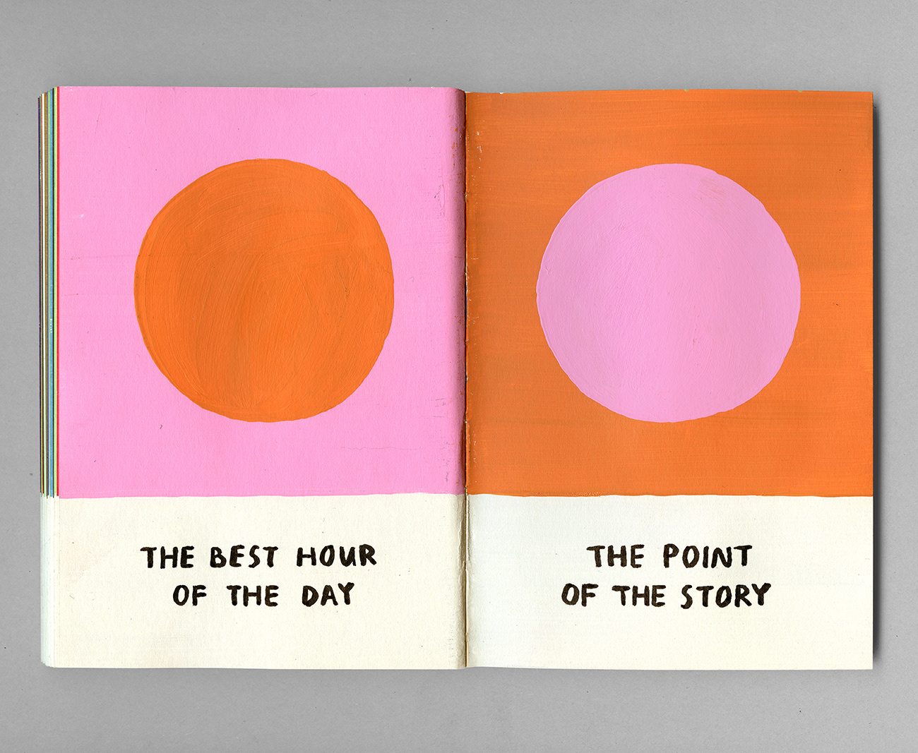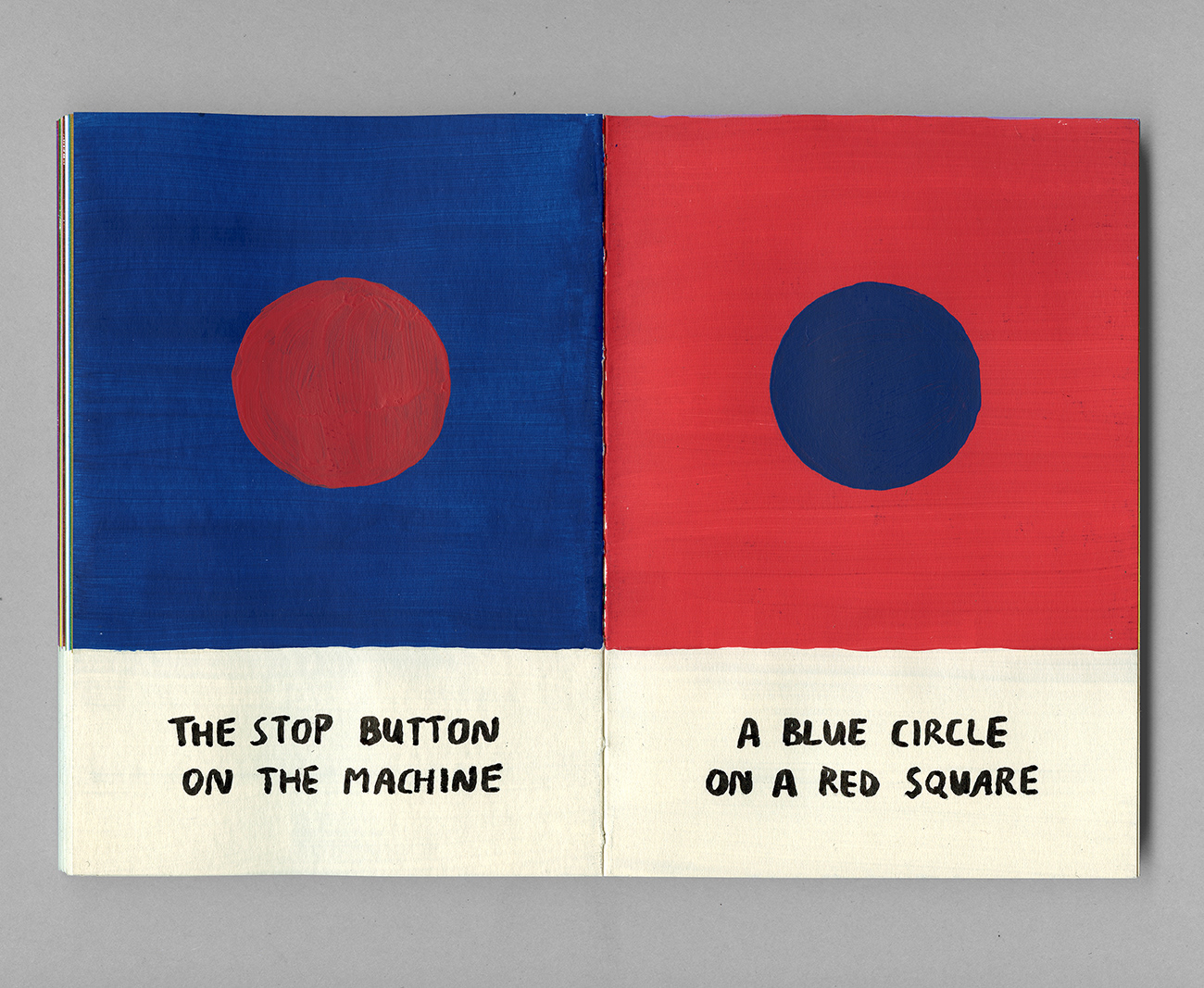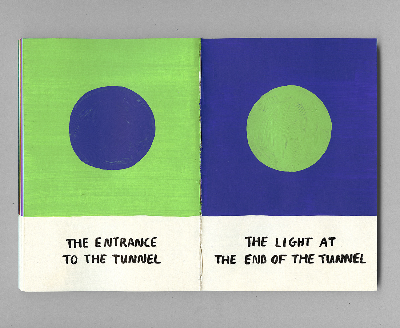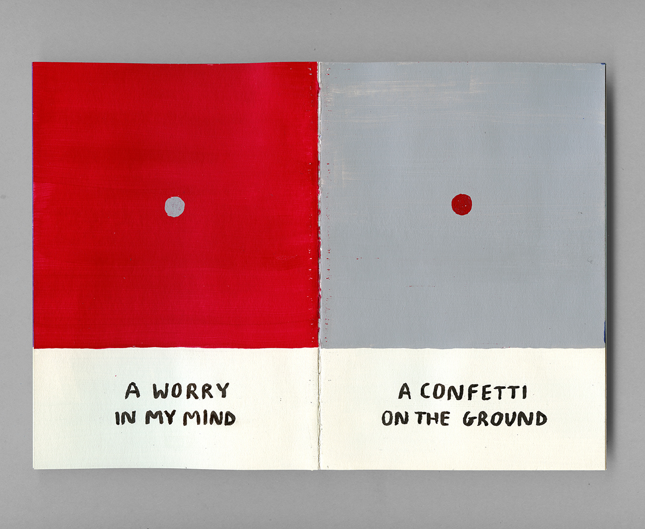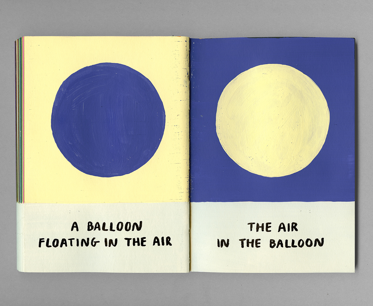 This hand painted book project stems from an imaginative game of association using only pairs of identical circles, presented across double page spreads in inverted colour combinations, as a simple prompt. Over 37 pairs, I responded with the accompanying bits of text to the shape, size and colour of the circles and tried to make connections or surprising leaps between them. This project was inspired by ‘A moon or a button: A collection of first picture ideas’ by Ruth Krauss and Remy Charlip. Acrylic Painted book, 76 pages, 10.5 x 14.8 cm, 2024.