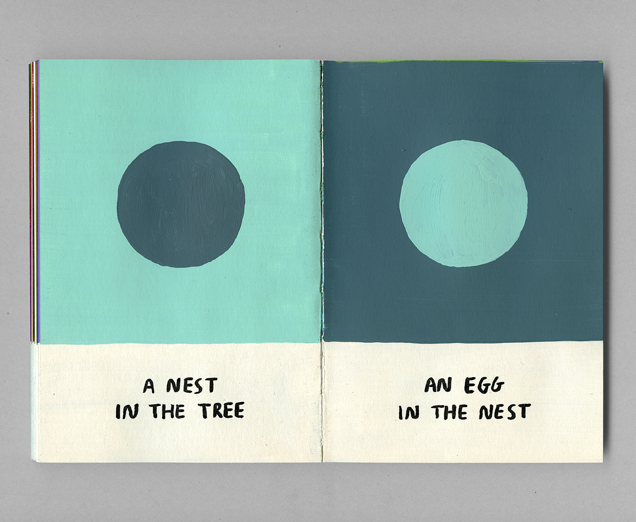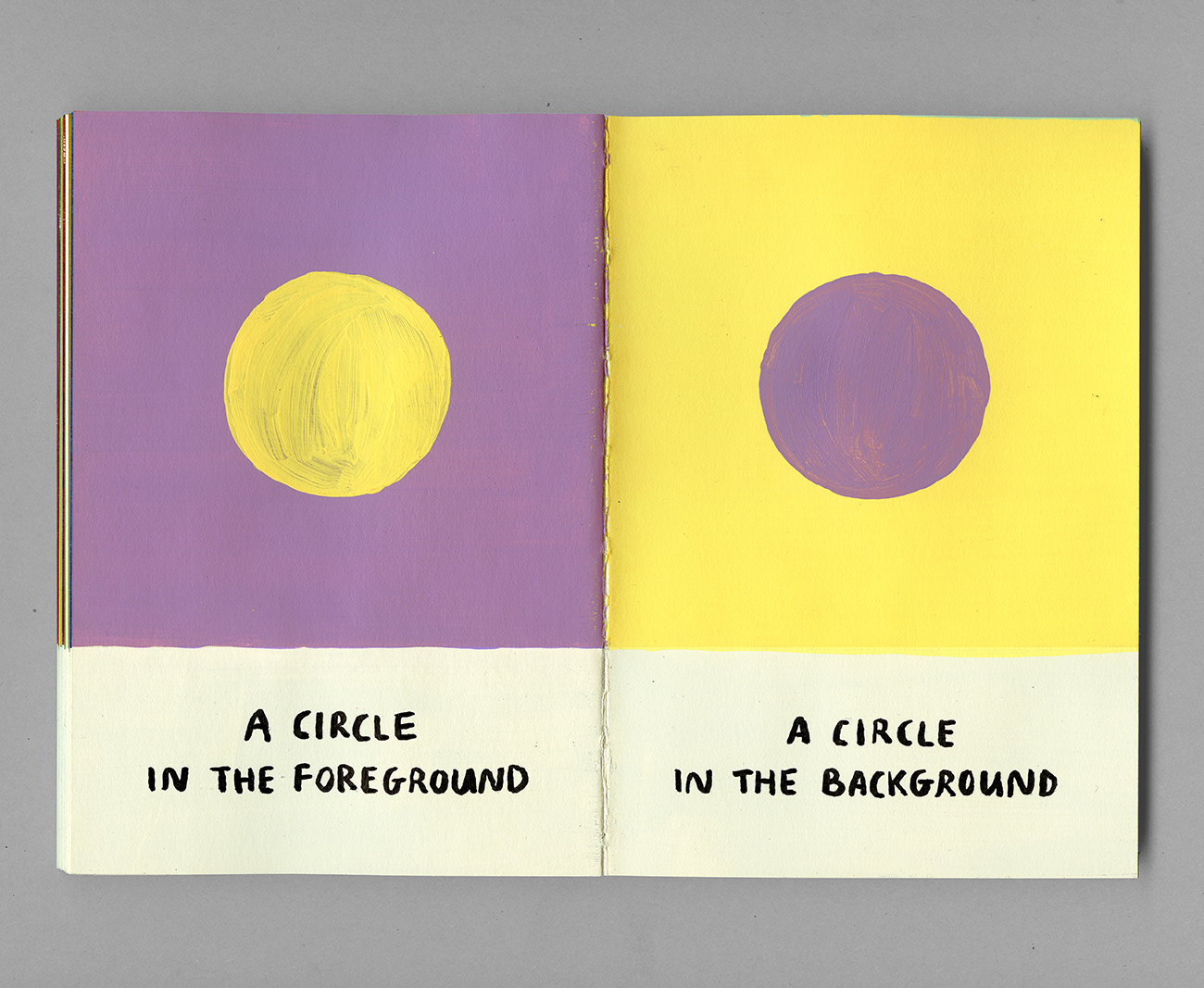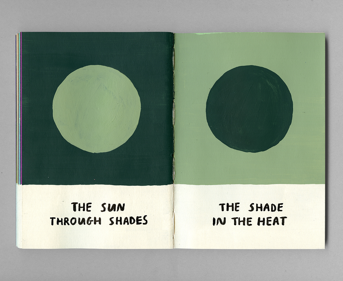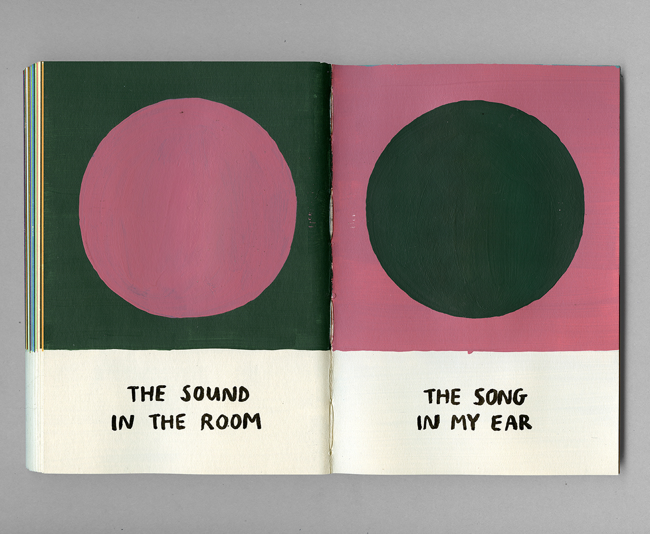 This hand painted book project stems from an imaginative game of association using only pairs of identical circles, presented across double page spreads in inverted colour combinations, as a simple prompt. Over 37 pairs, I responded with the accompanying bits of text to the shape, size and colour of the circles and tried to make connections or surprising leaps between them. This project was inspired by ‘A moon or a button: A collection of first picture ideas’ by Ruth Krauss and Remy Charlip. Acrylic Painted book, 76 pages, 10.5 x 14.8 cm, 2024.