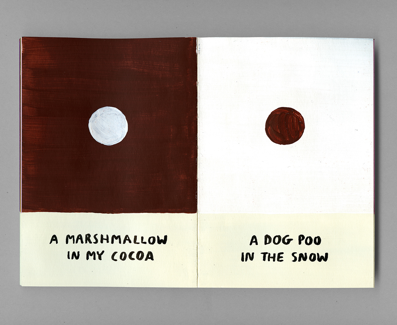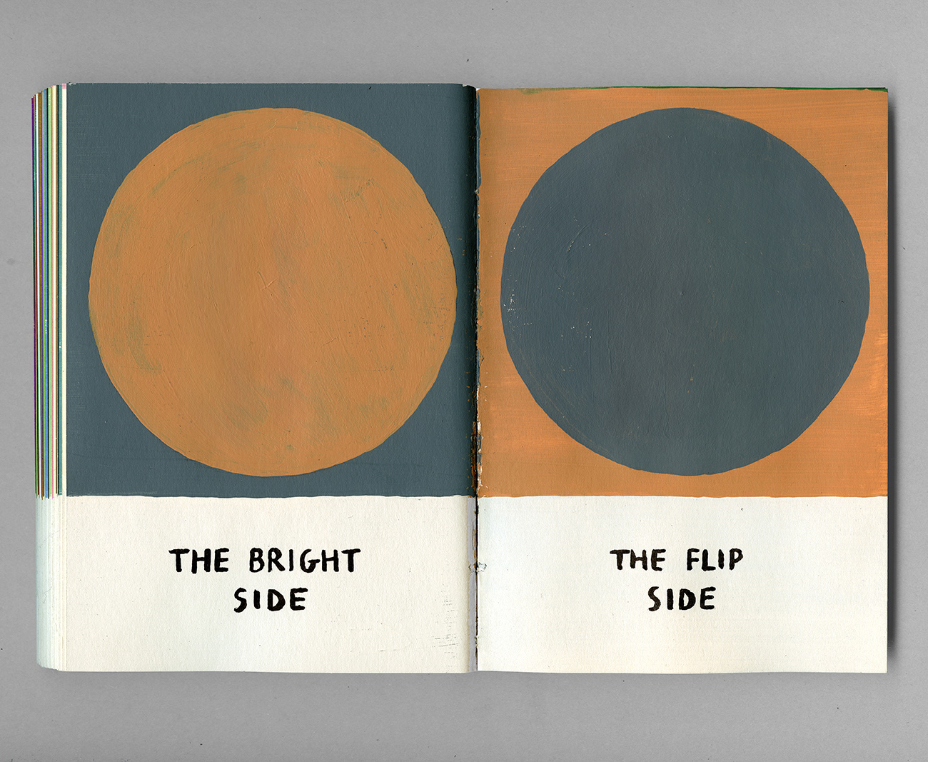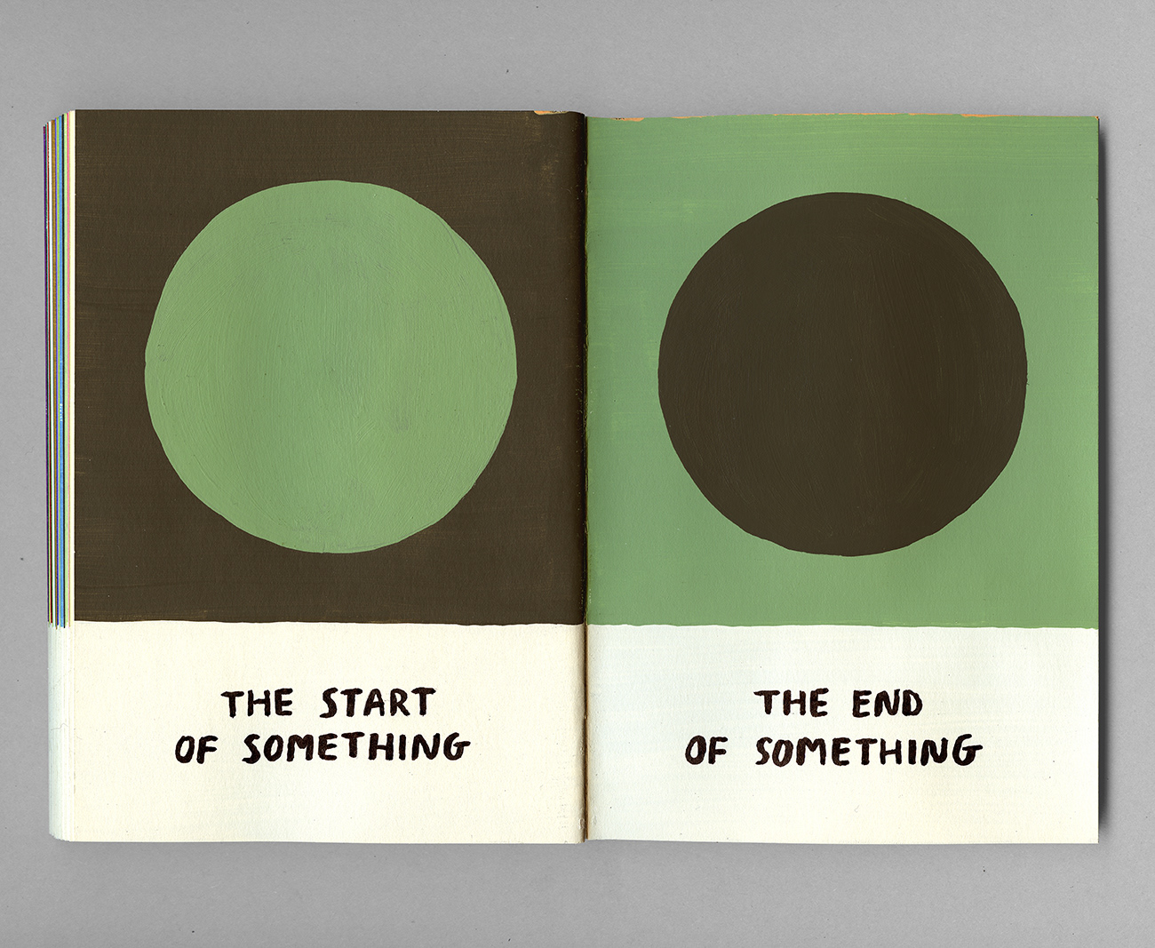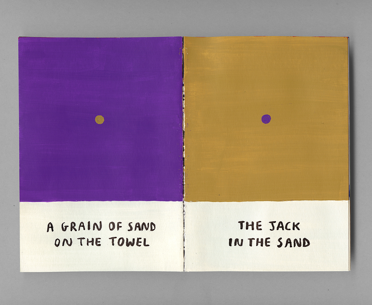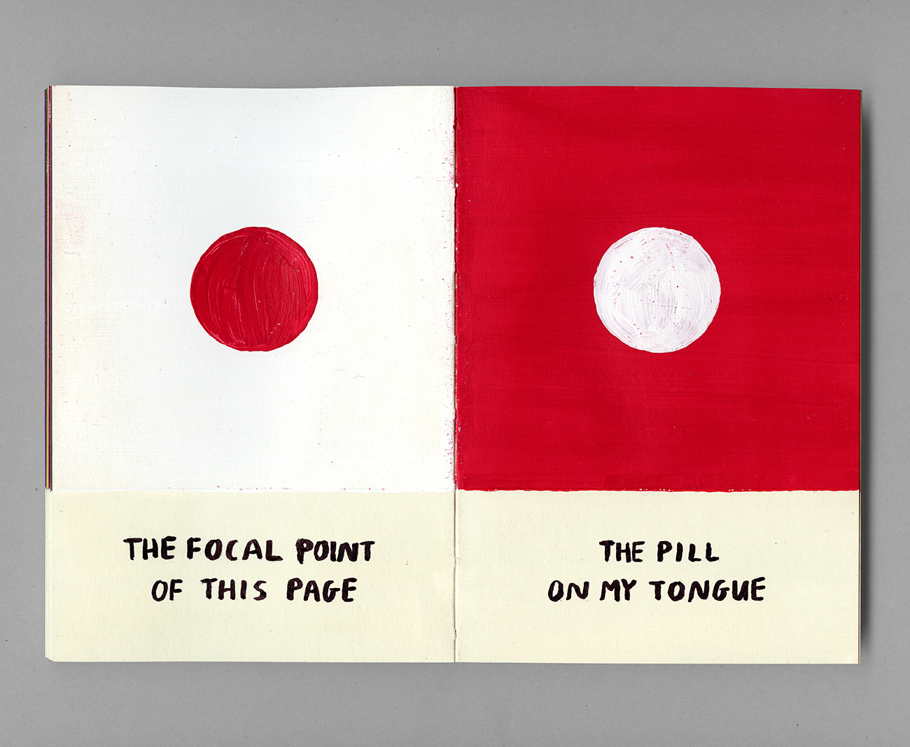 This hand painted book project stems from an imaginative game of association using only pairs of identical circles, presented across double page spreads in inverted colour combinations, as a simple prompt. Over 37 pairs, I responded with the accompanying bits of text to the shape, size and colour of the circles and tried to make connections or surprising leaps between them. This project was inspired by ‘A moon or a button: A collection of first picture ideas’ by Ruth Krauss and Remy Charlip. Acrylic Painted book, 76 pages, 10.5 x 14.8 cm, 2024.