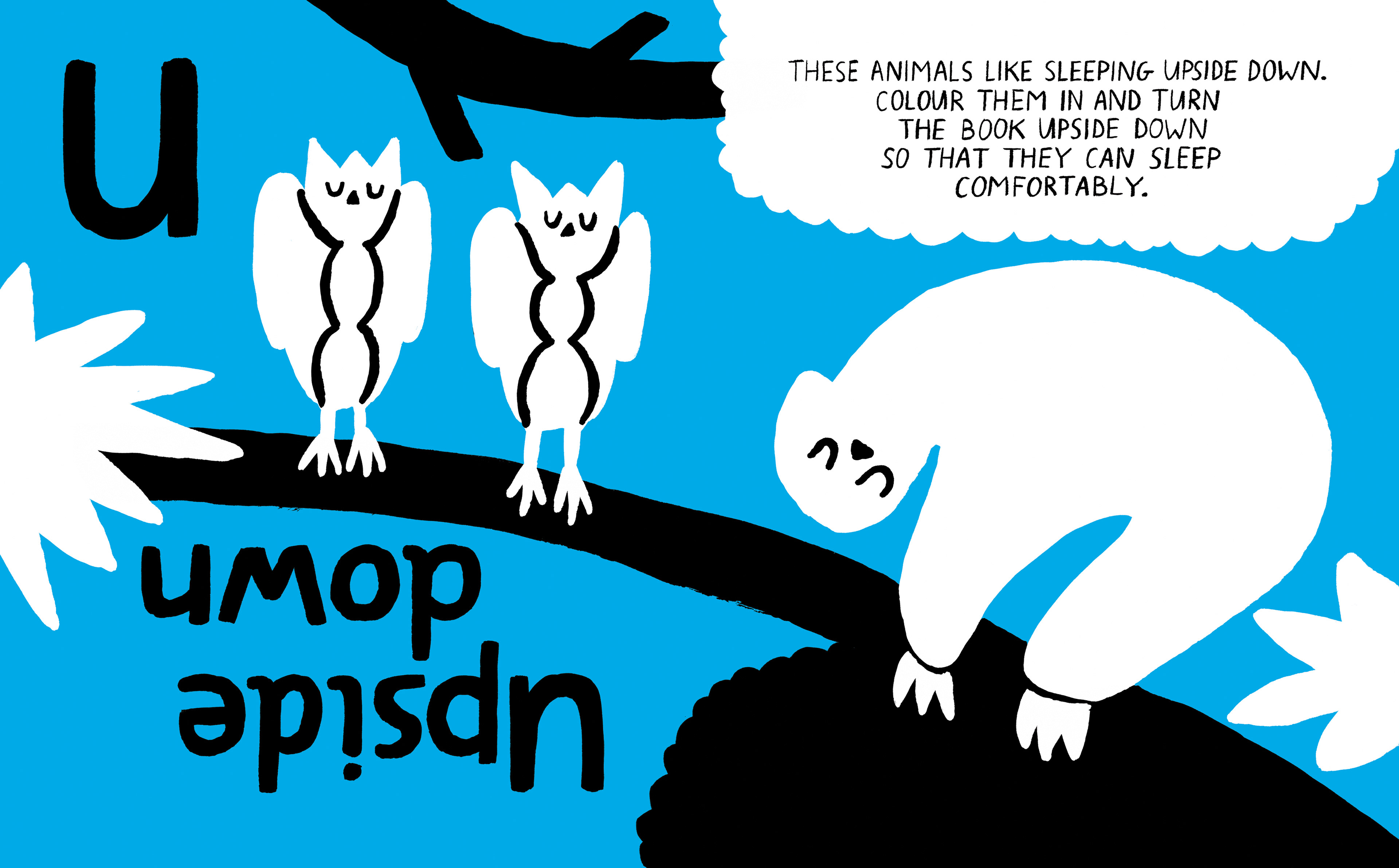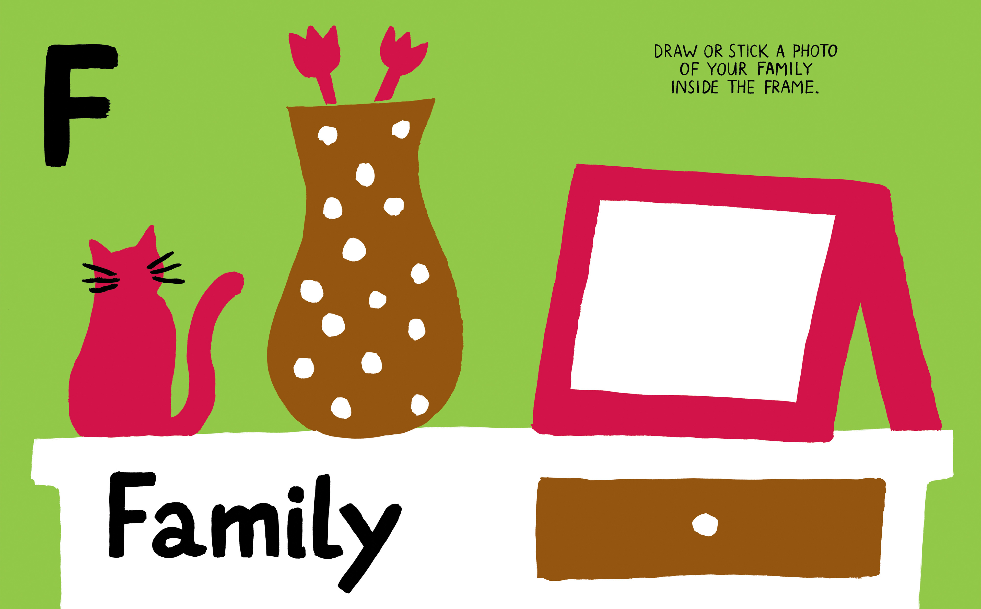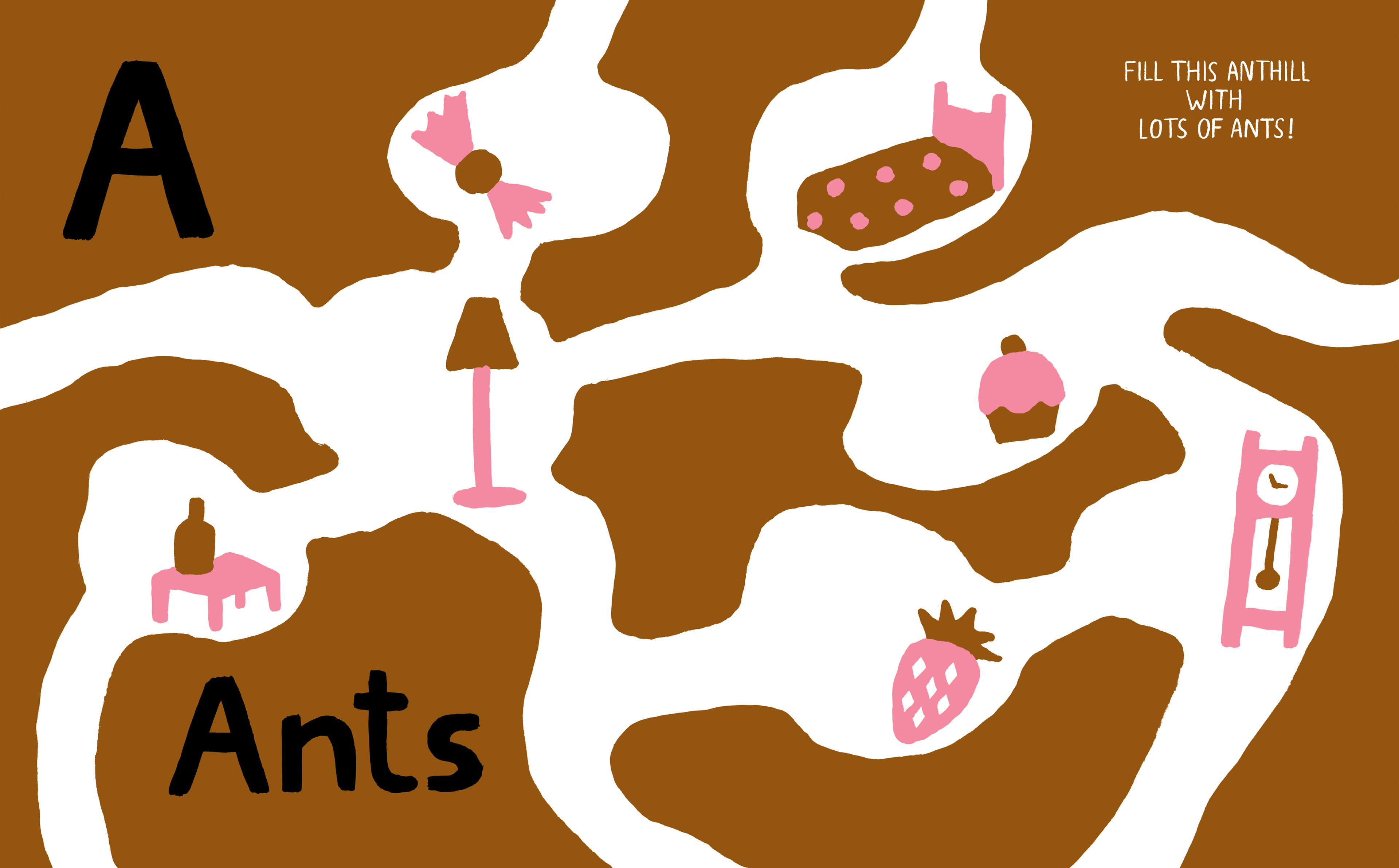 Published in the UK by Cicada Books, 2016 Other editions: Chinese Engage with the alphabet by doodling, stickering or collaging the illustrations that relate to each letter. From drawing the ants in their anthill home to painting the zebra's stripes, every page is waiting to be completed by you. Boardbook with flaps and stickers, 17.5cm x 21.5 cm, 56 pages