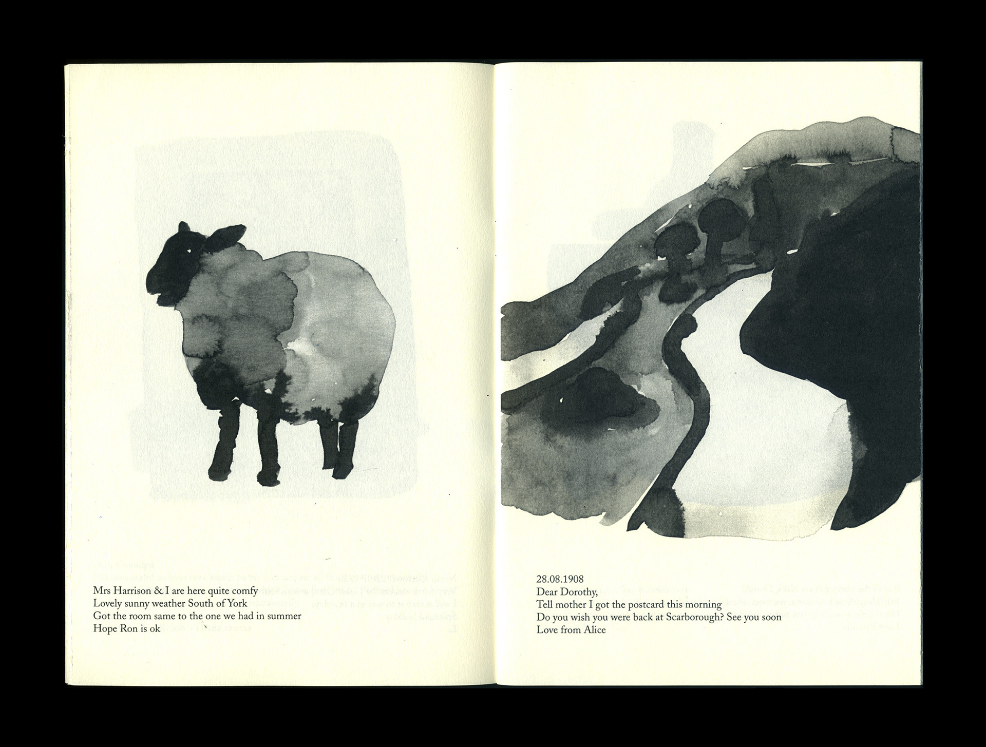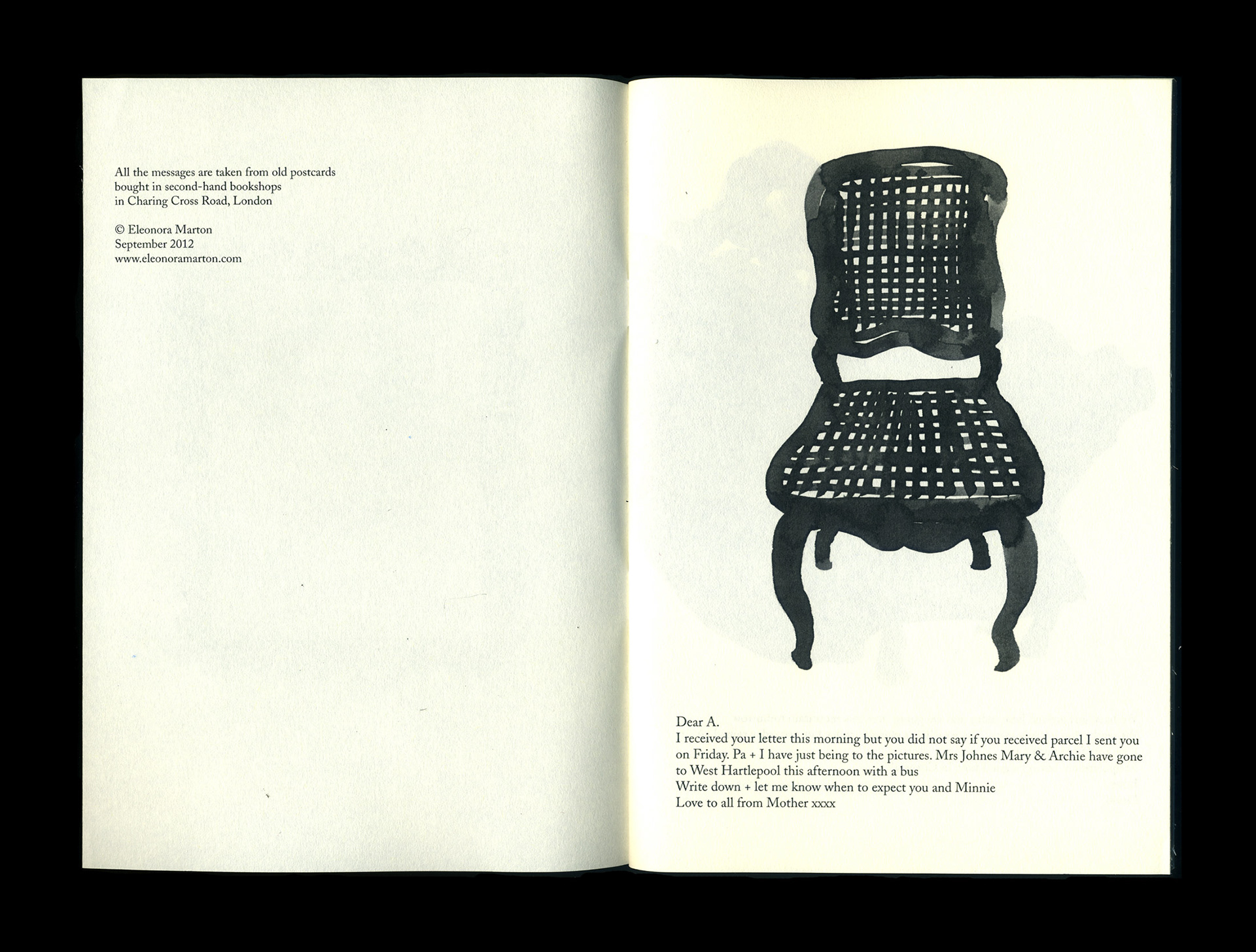 Self published zine, 2012 All the messages are taken from old postcards bought in second-hand bookshops in Charing Cross Road, London. b/w photocopy on paper, 144x210 mm, 28 pages, numbered limited edition of 100